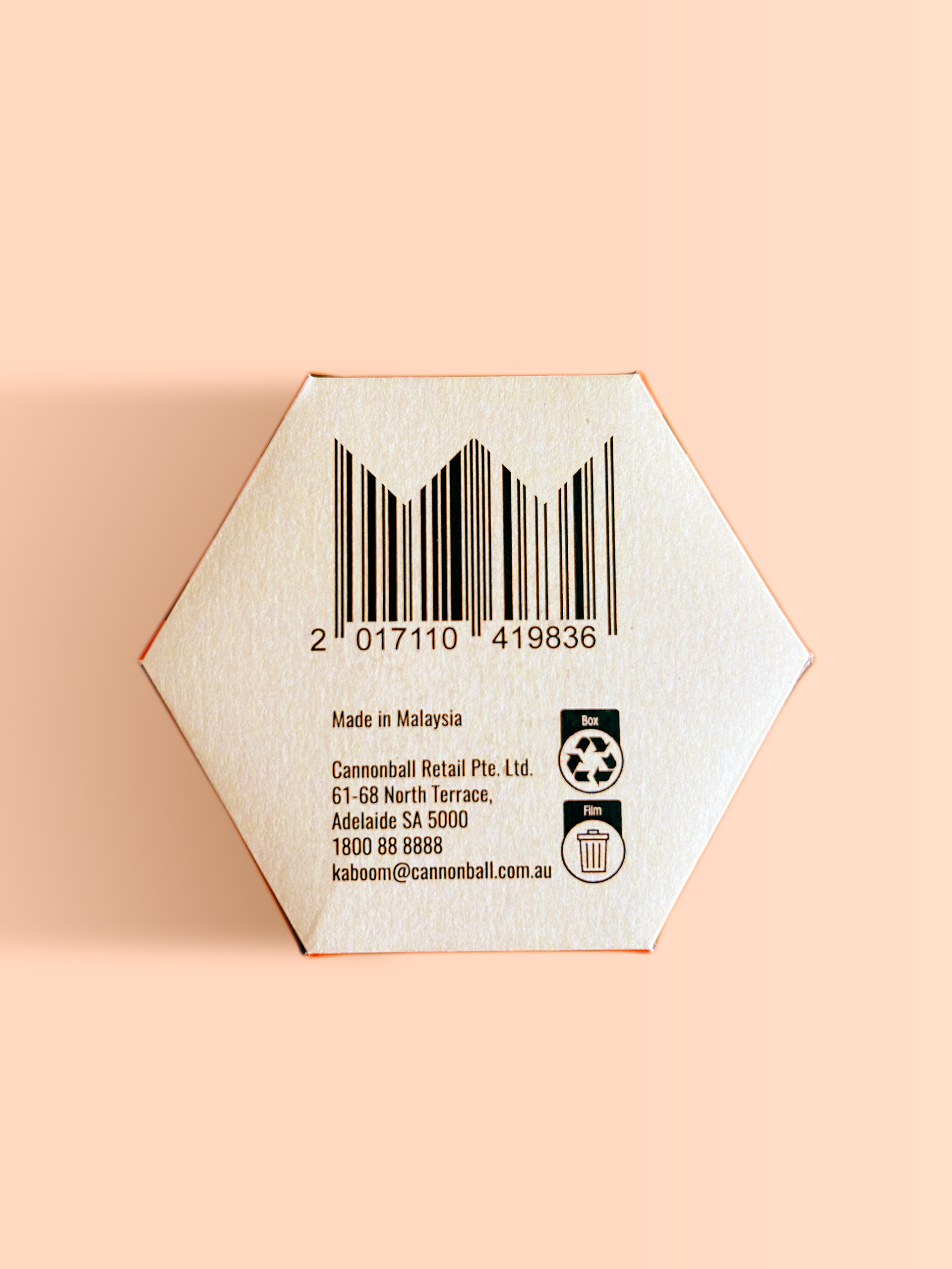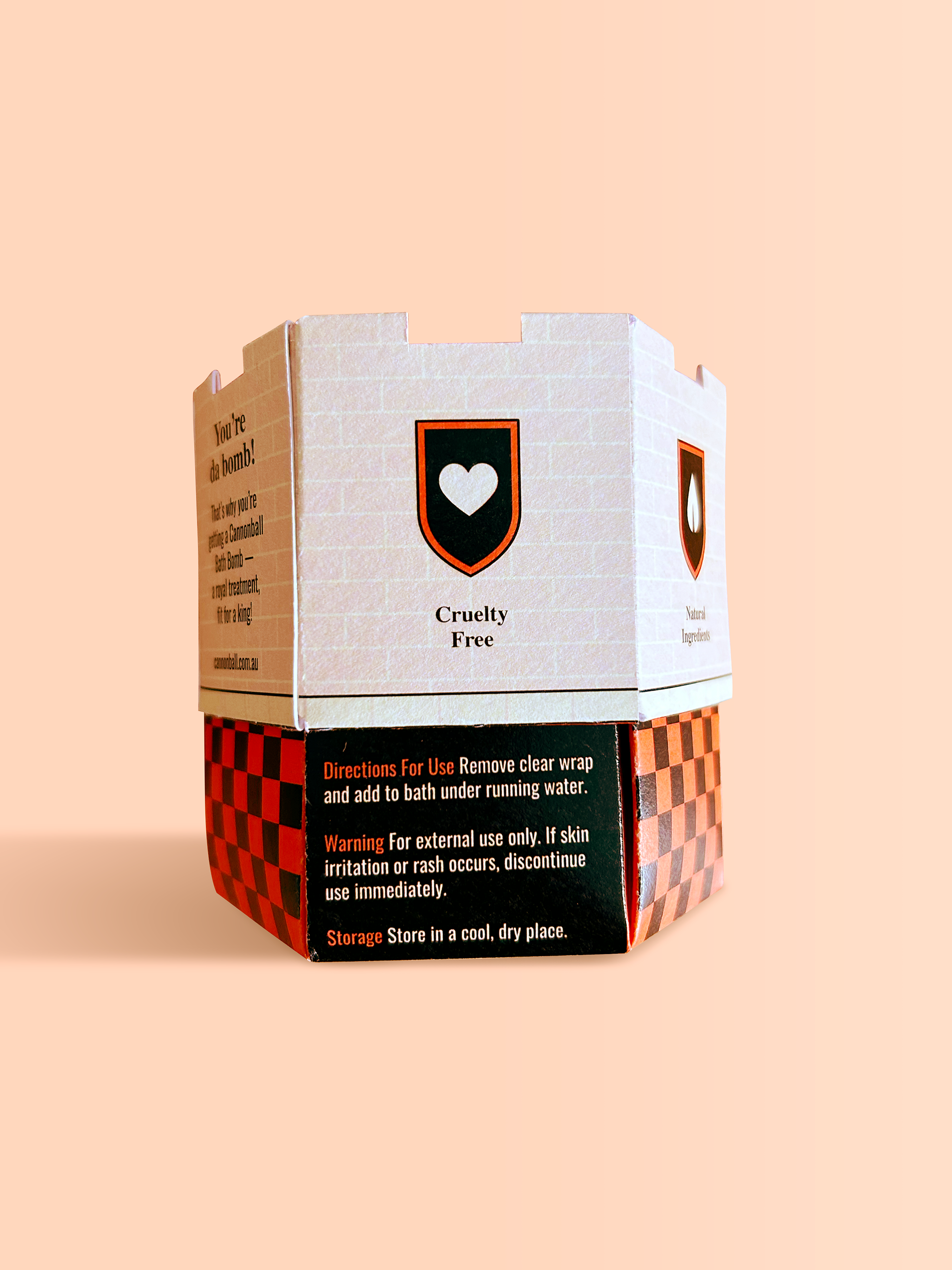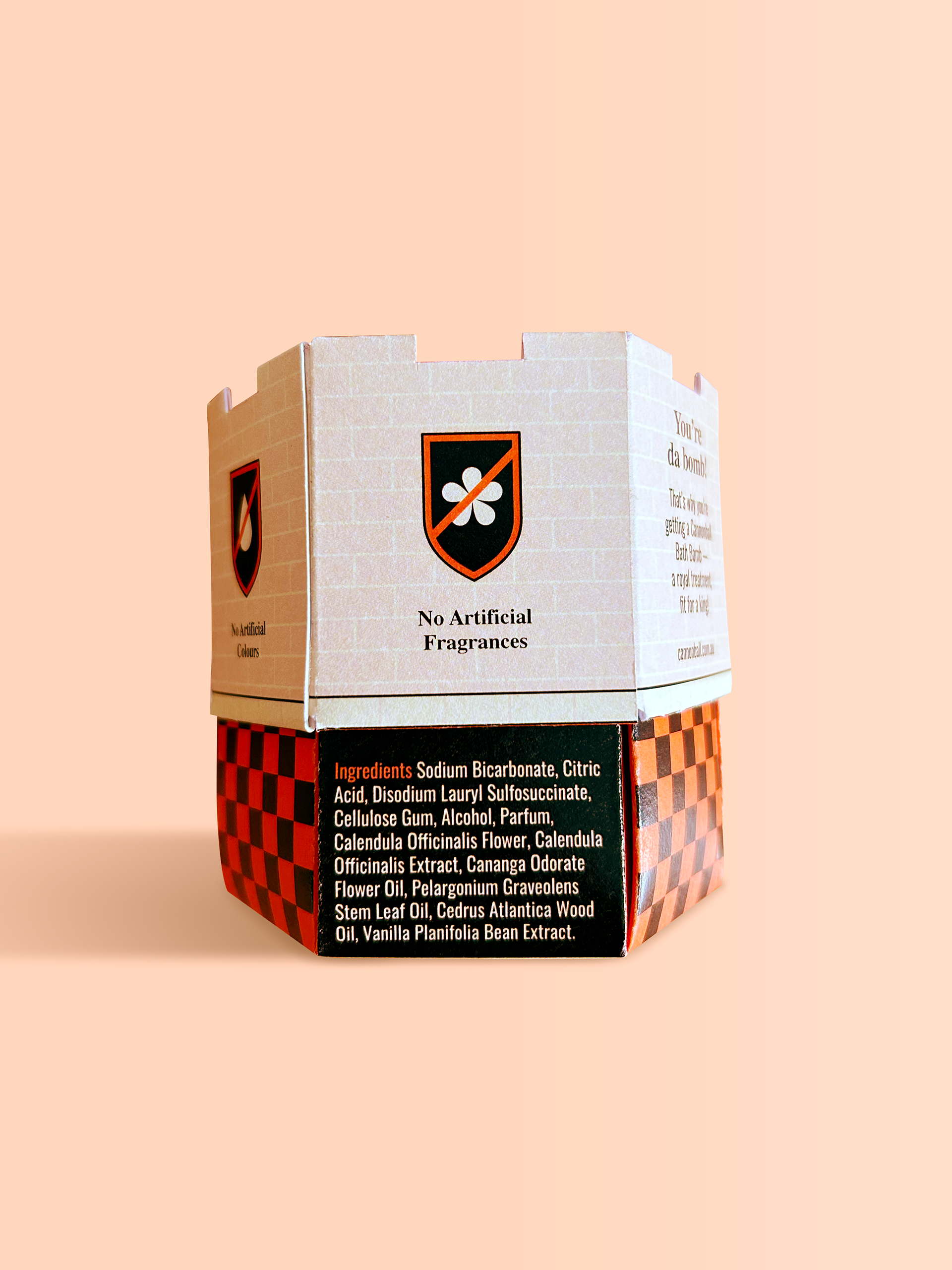 As it is a premium brand, the end user’s unboxing experience is just as important as the product itself. The packaging is essentially a box with a top lid—a format common in expensive cologne, jewellery, and watches. Rejecting a square box, the packaging adopts a hexagonal form that securely wraps around the bath bomb nice and tight.