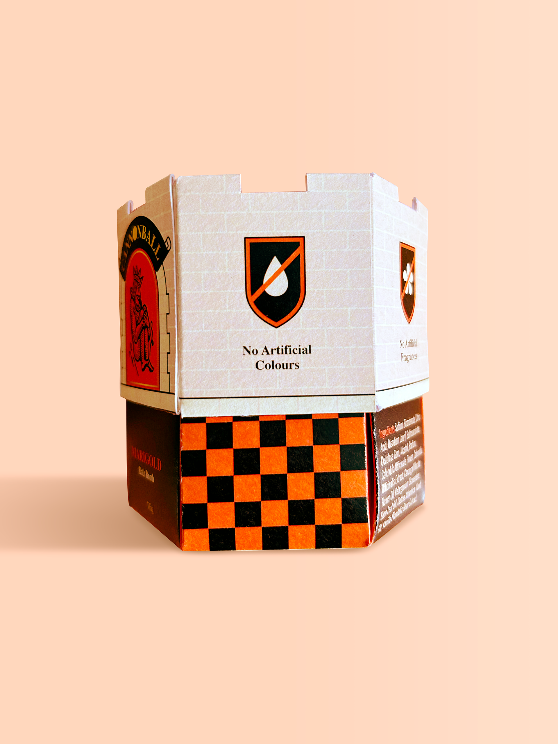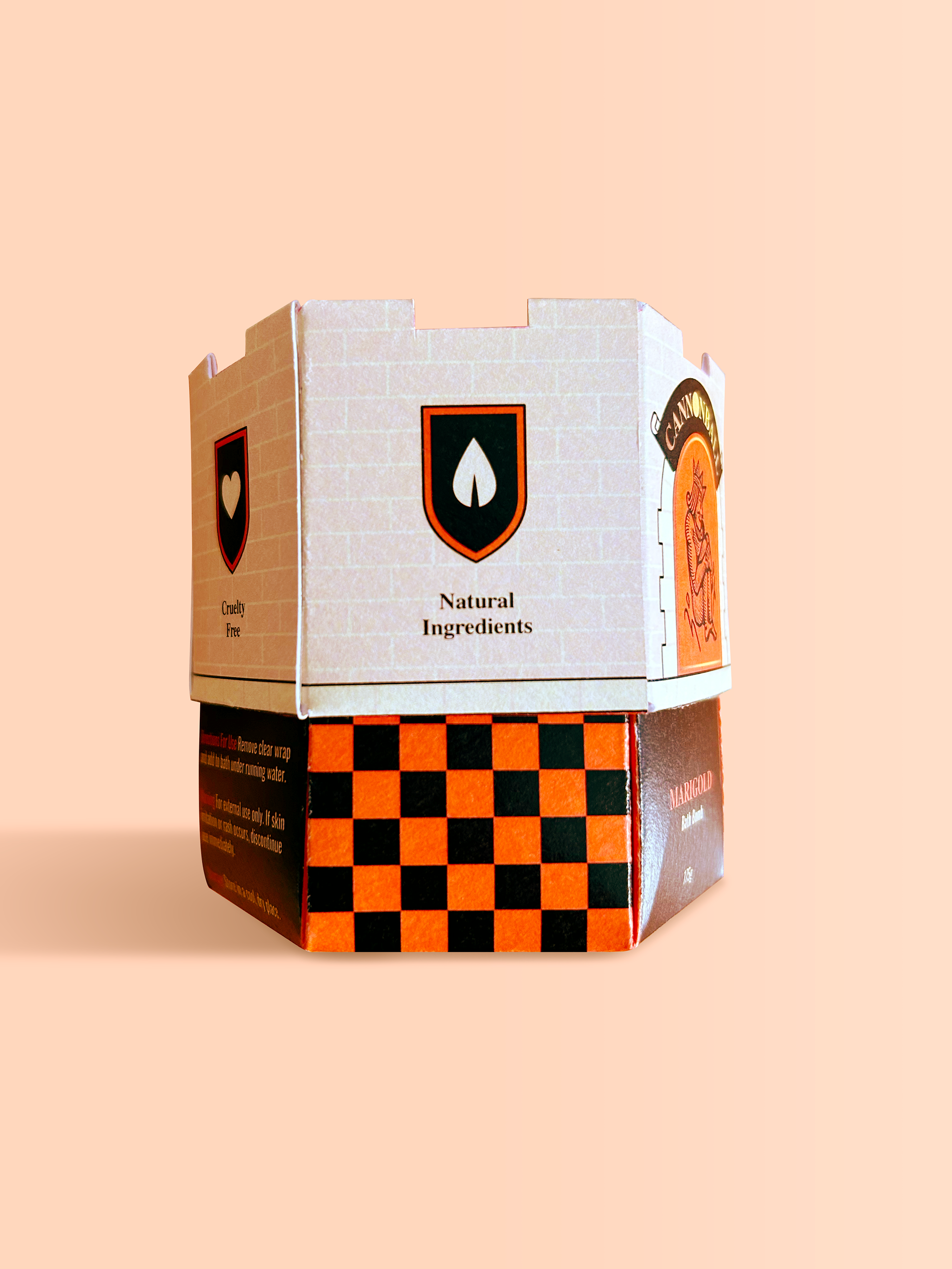 The simple icons for the four USPs were constructed inspired by heraldic emblems and the suites from playing cards. They sat on shields—another Medieval motif, hung against a backdrop of brick layered castle wall. Additionally, different scents can be represented by different patterns borrowed from coat of arms in different accent colour. The front of the box is embellished with gold foil stamp logotype and inner arch border to look exclusive and expensive.