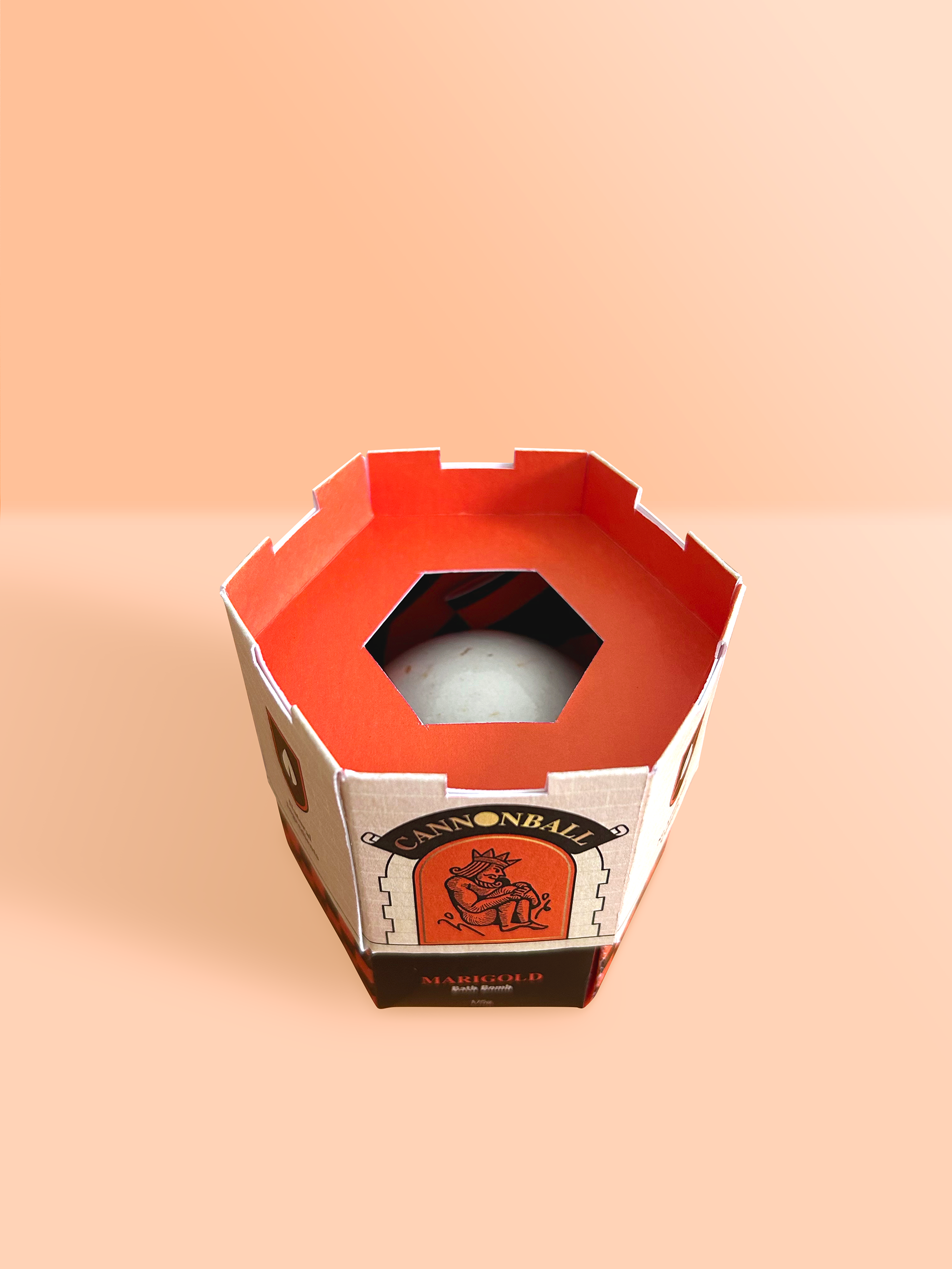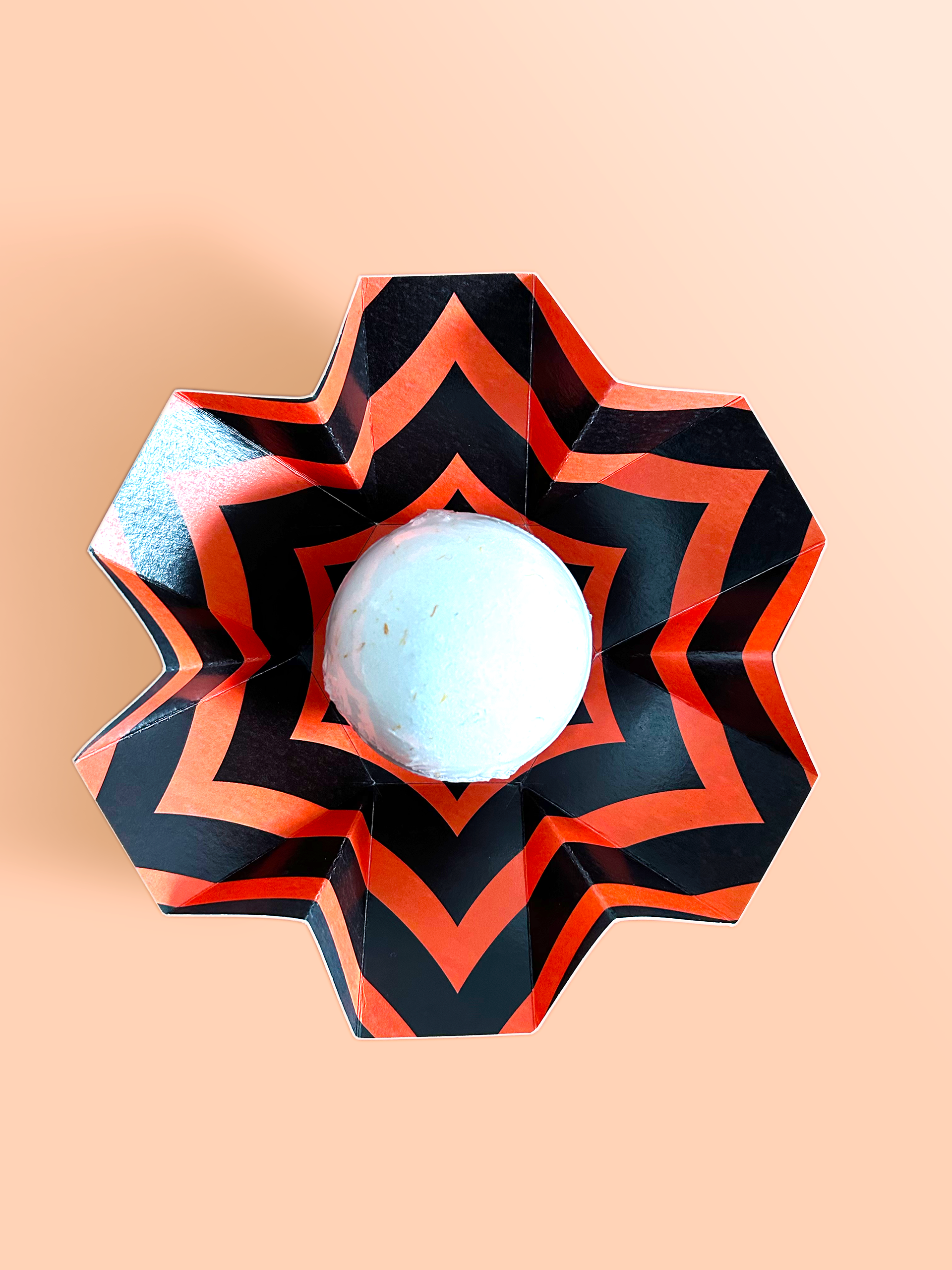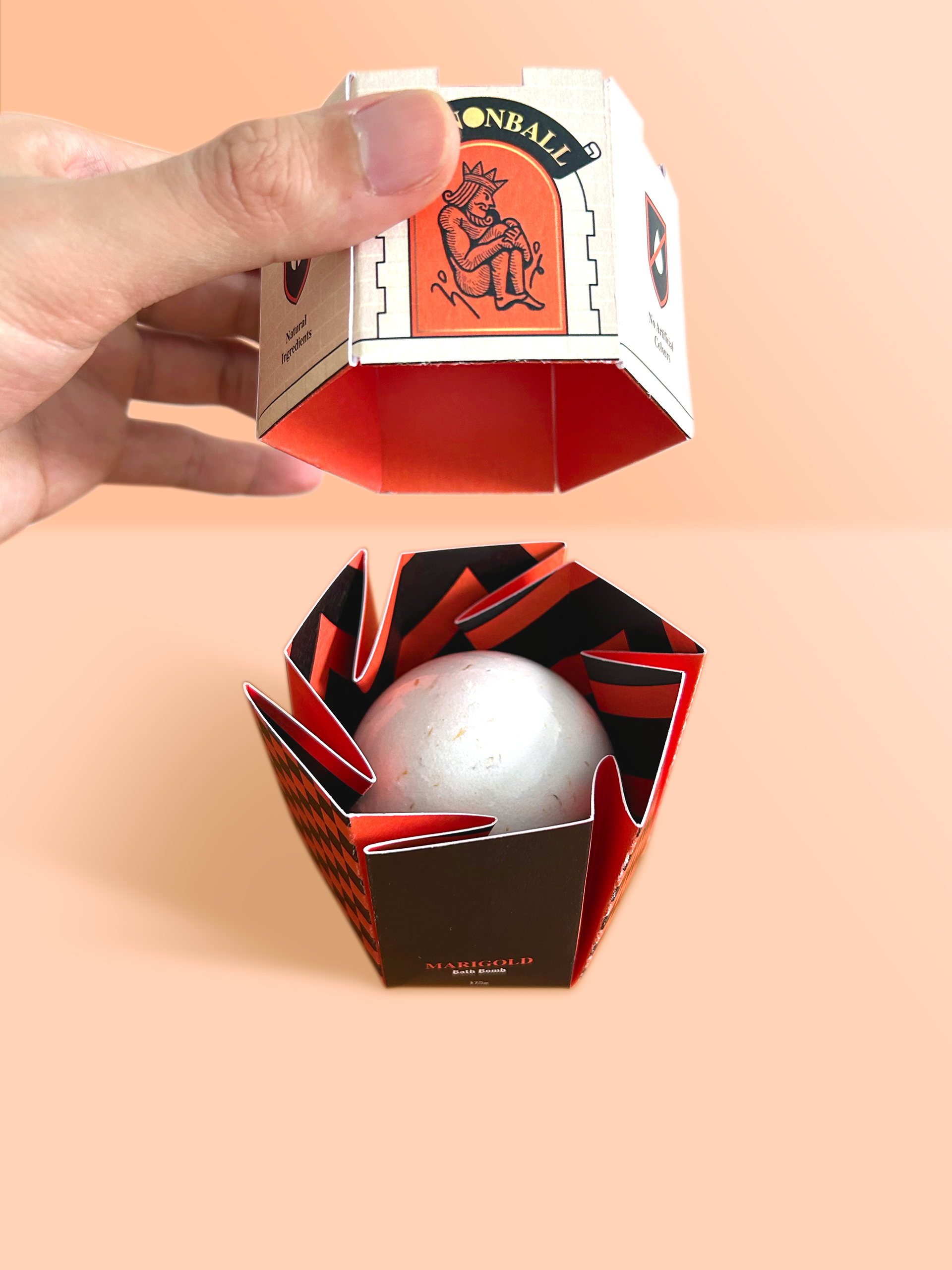 The bottom box is constructed with a piece of paper with folding lines and no adhesive. Its inner side lined with a starburst pattern, with the bath bomb sitting at the centre as focal point, like a baseball in a glove. When unboxed, it spreads out once top lid removed, mimics the explosion effect of a cannonball or a bath bomb.