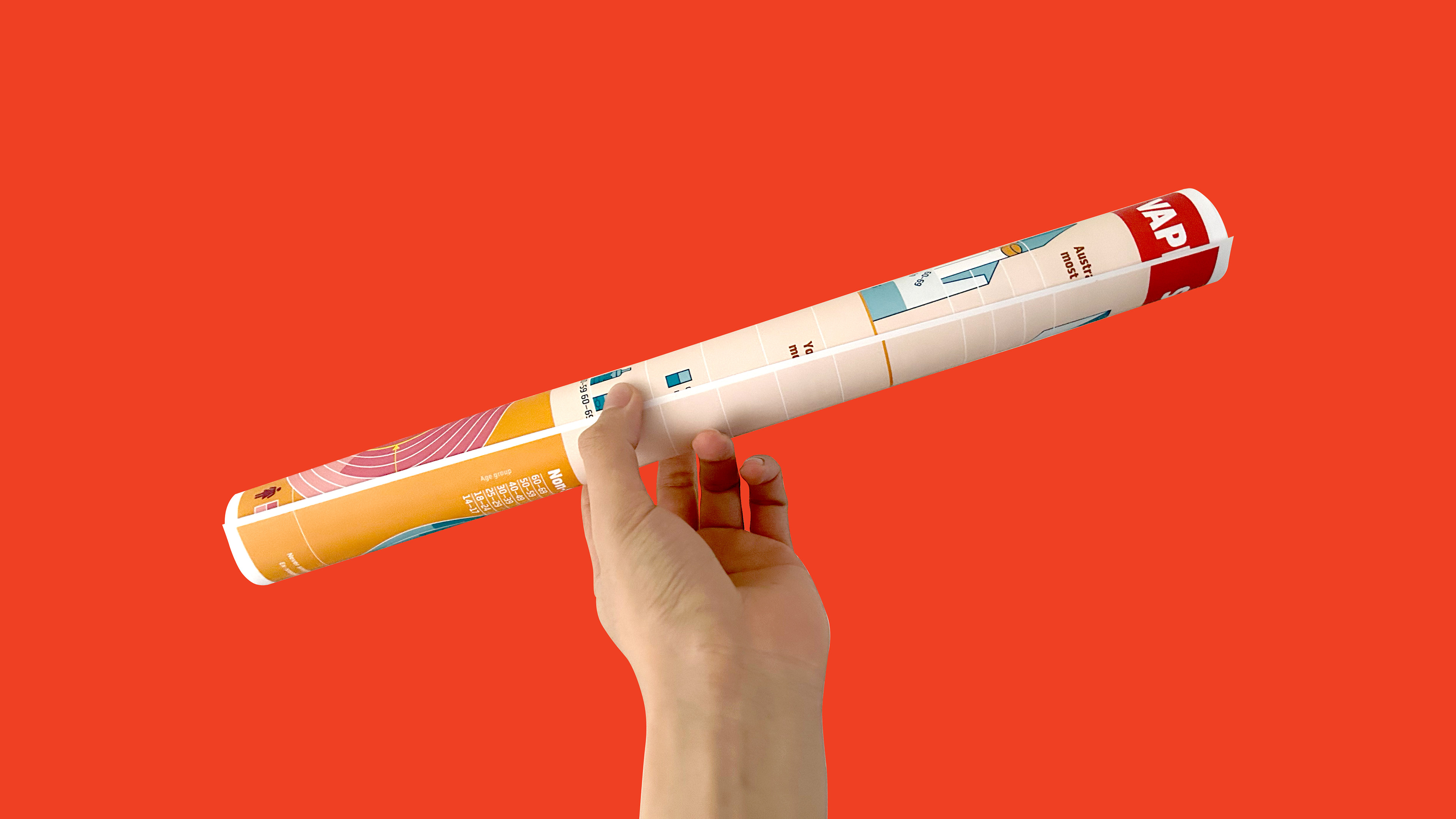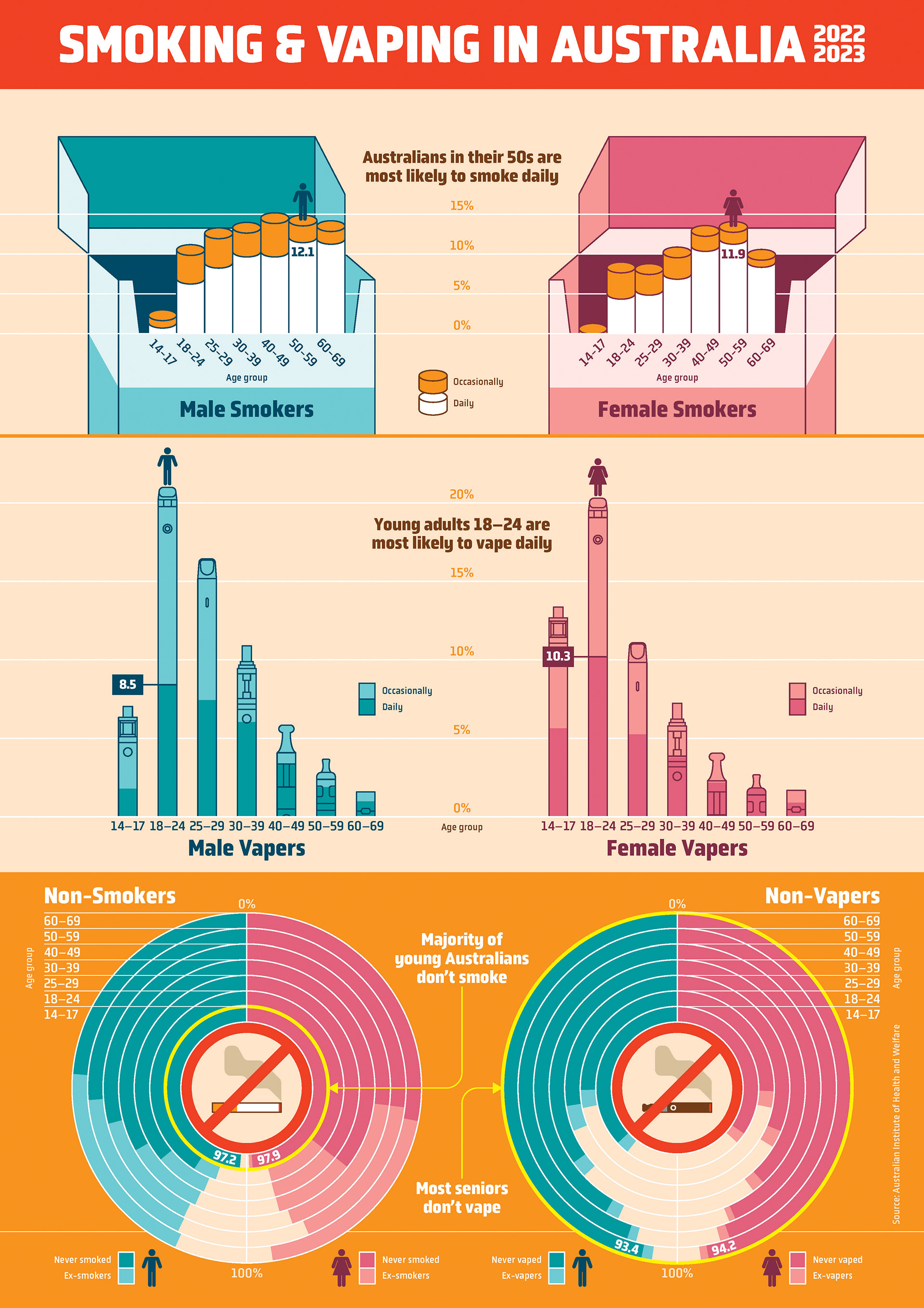 An A3 infographic poster on smoking and vaping in Australia based on the data available from 2022-2023. The colour segments are intended so that when the poster is rolled, it looks like a cigarette stick.