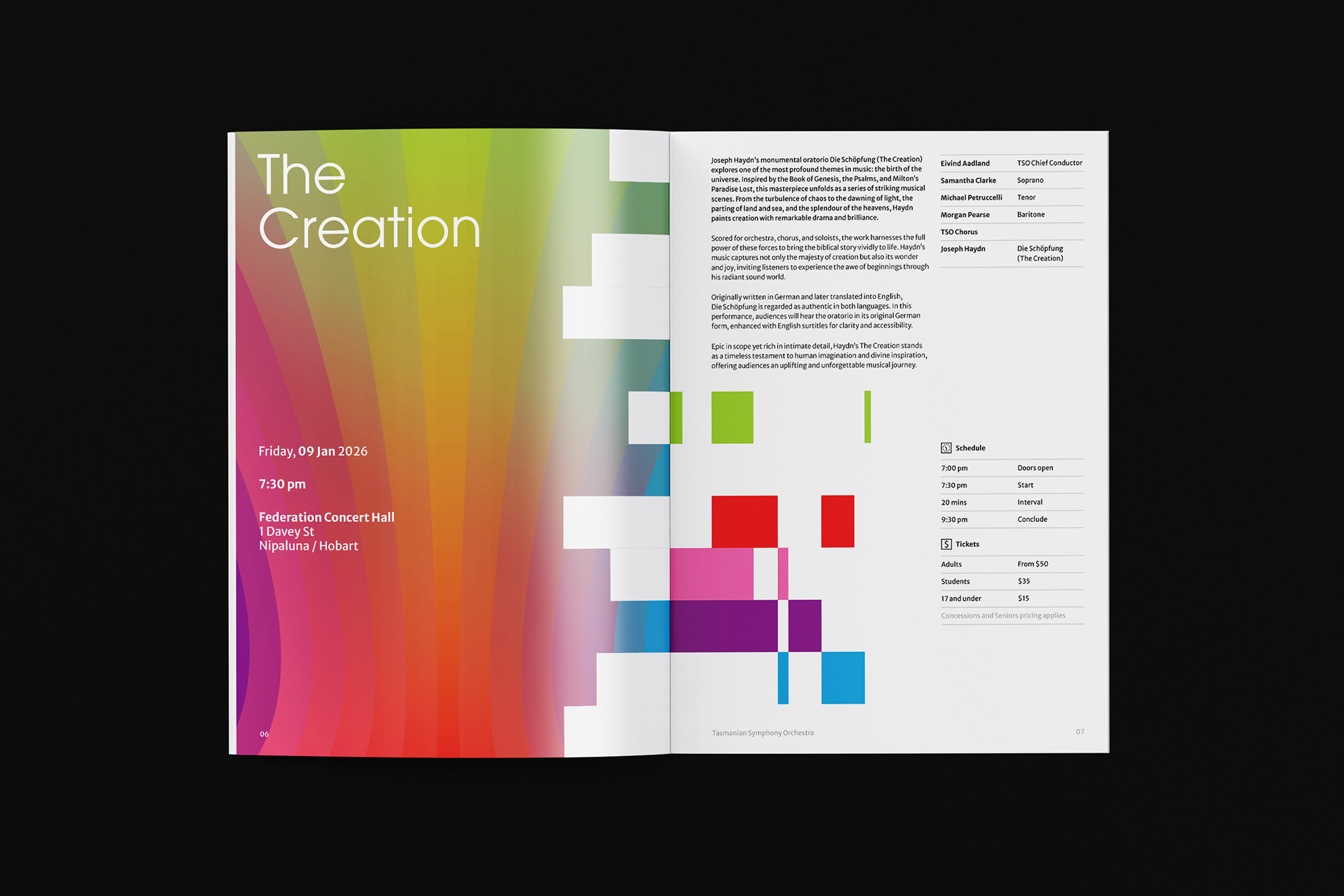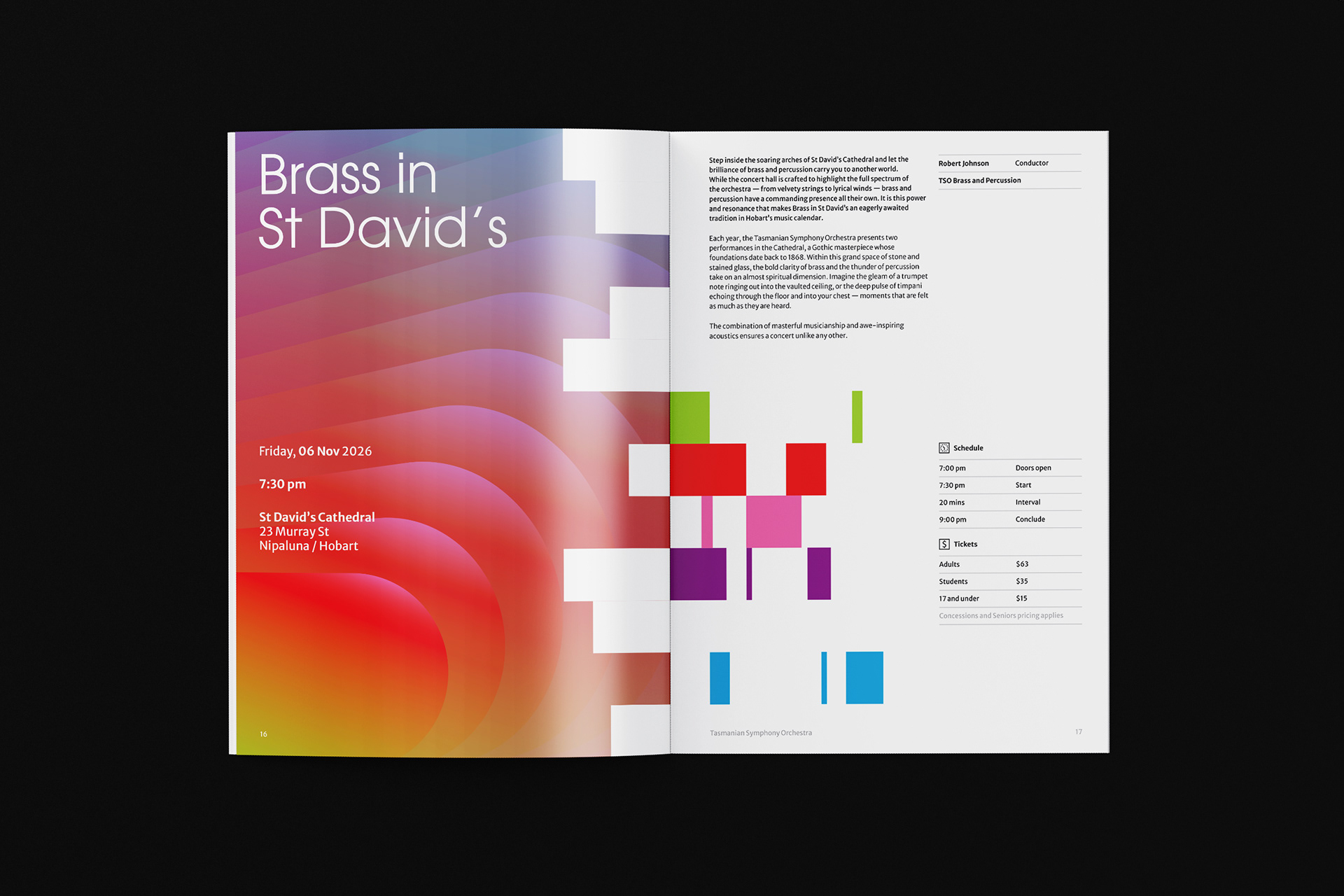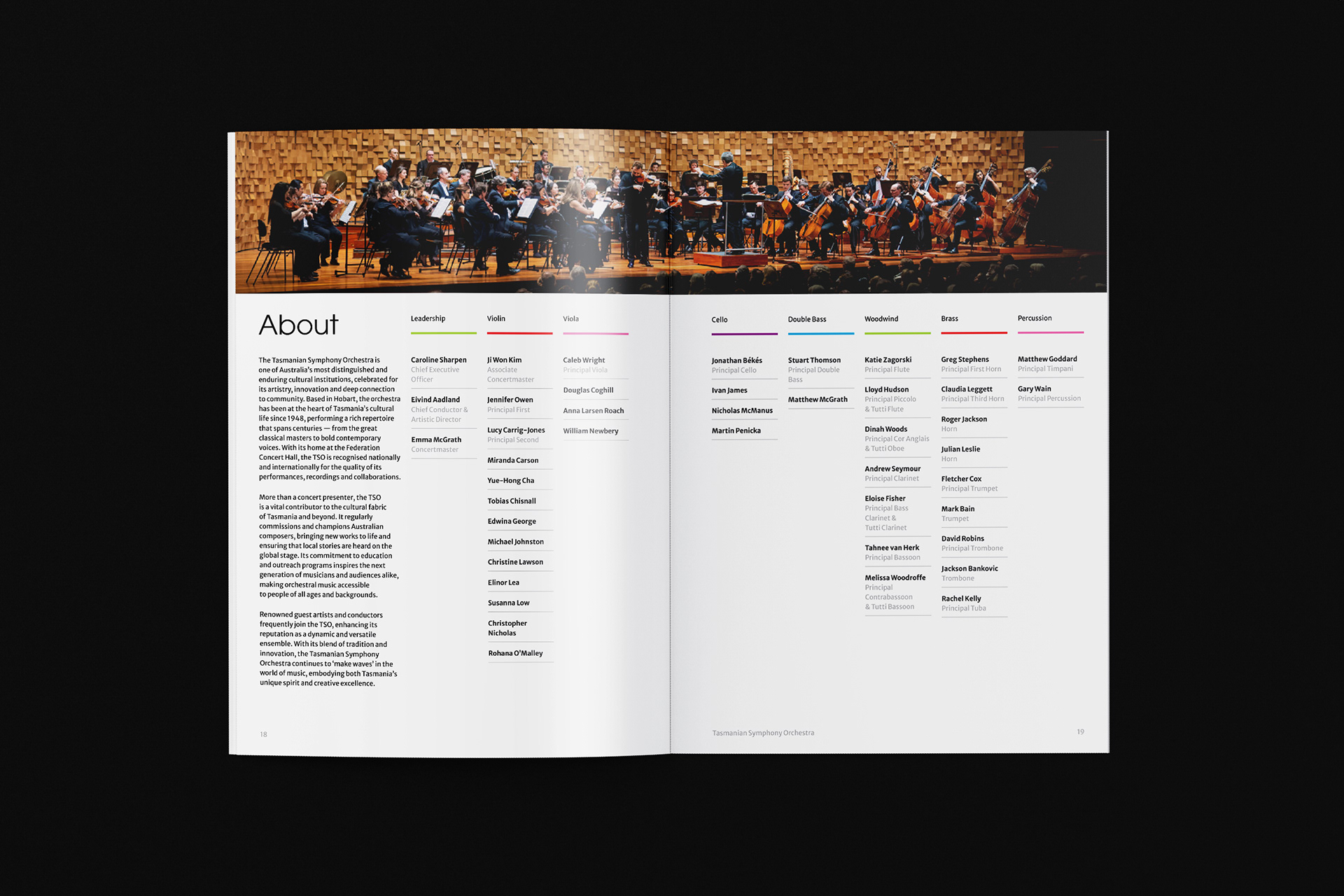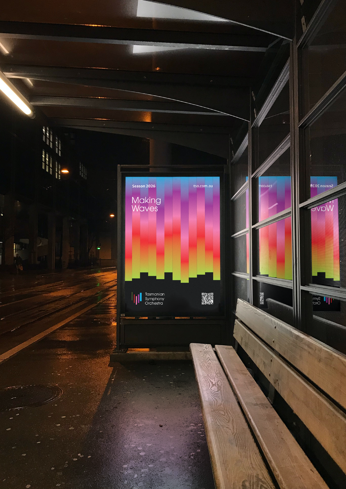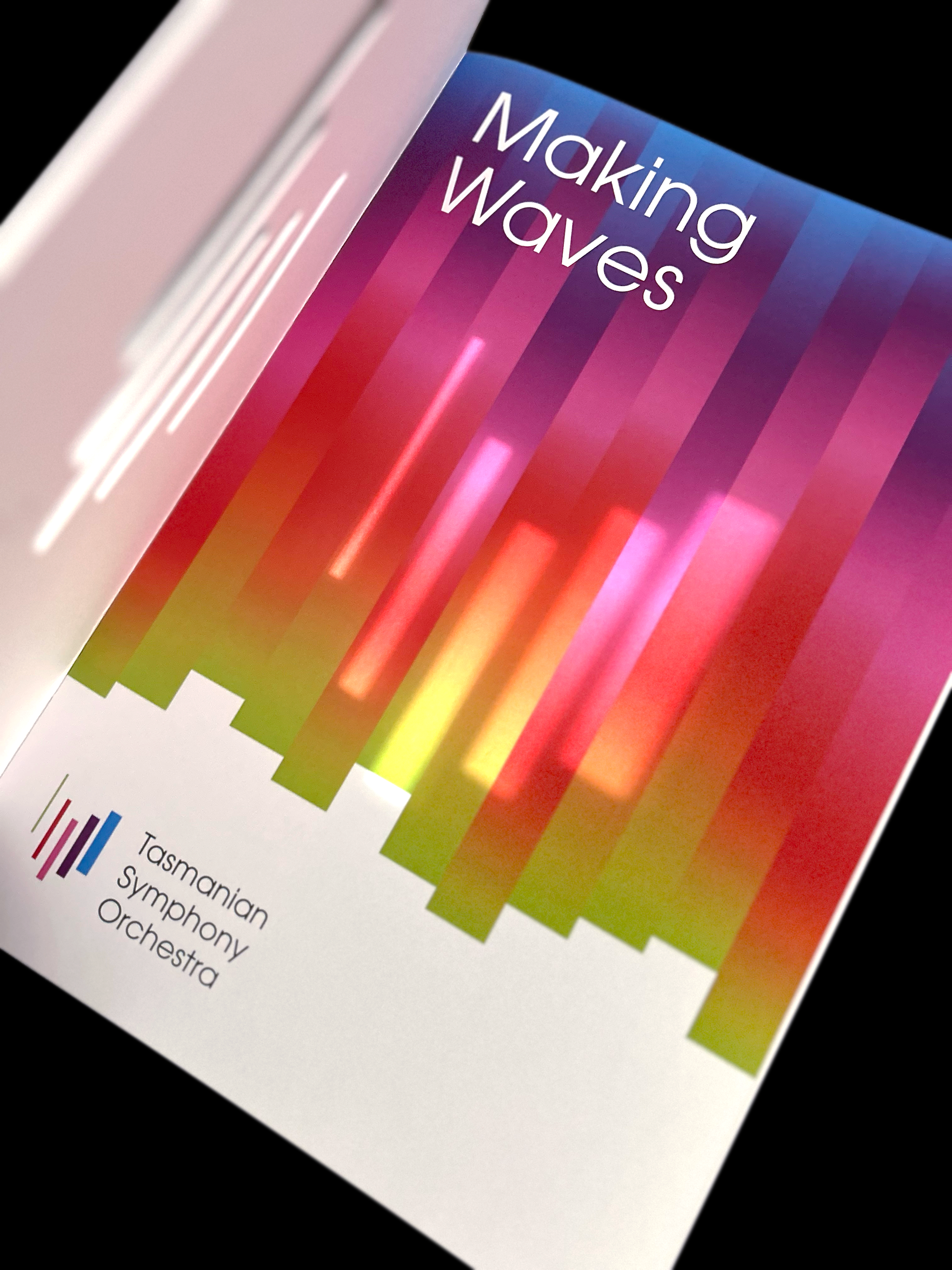 Tasmanian Symphony Orchestra rebrand introduces a logo with an abstract representation of the Tasmania island, constructed with five columns — a reference to the musical staff. From left to right, the columns grew from thin to thick, with narrowing gaps in between, descending then ascending, suggesting movement and rhythm. Brand colours are inspired by the vivid, magical Southern Lights. This multicolour, asymmetrical approach symbolizes the union of different musical instruments played by and for people from all walks of life.