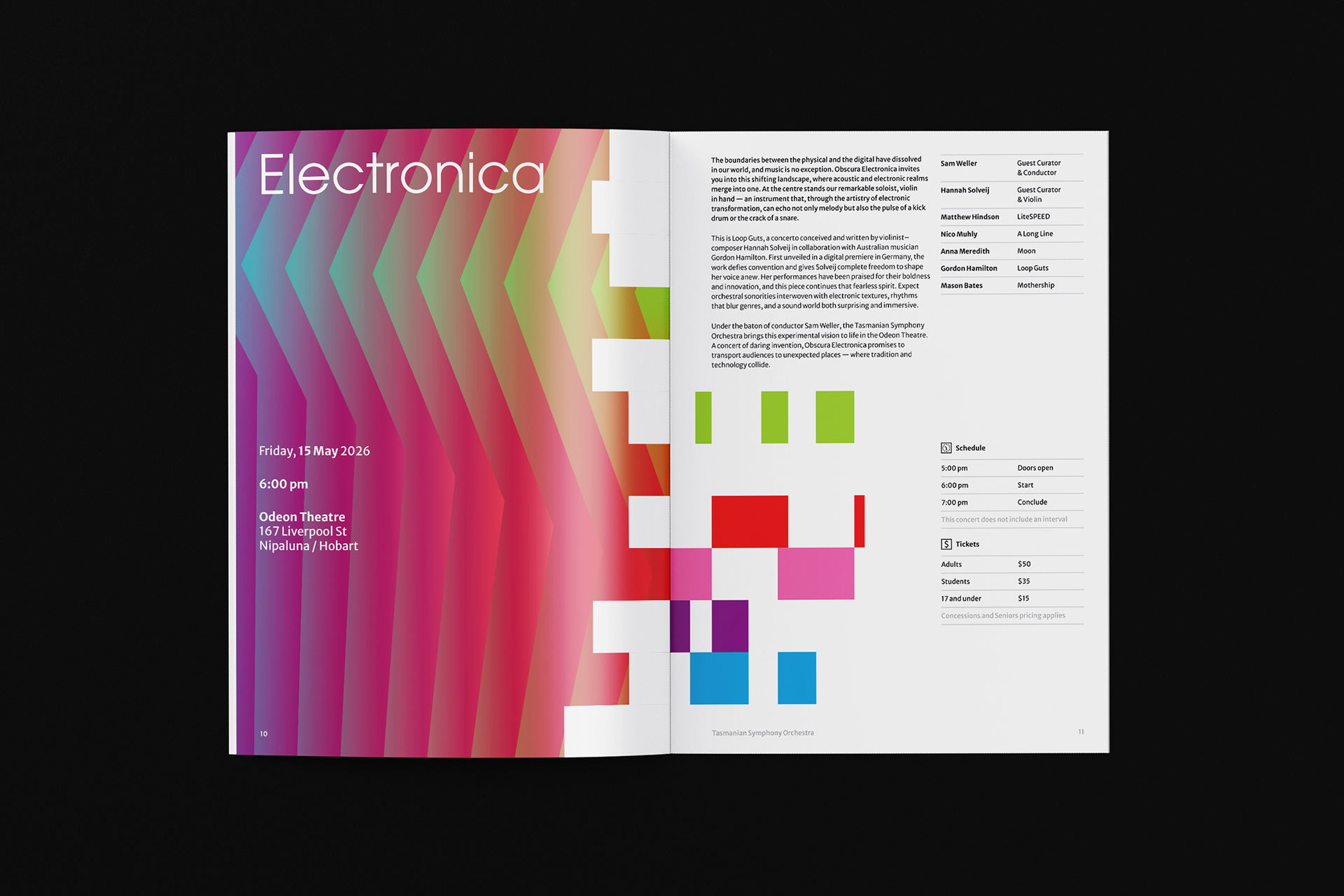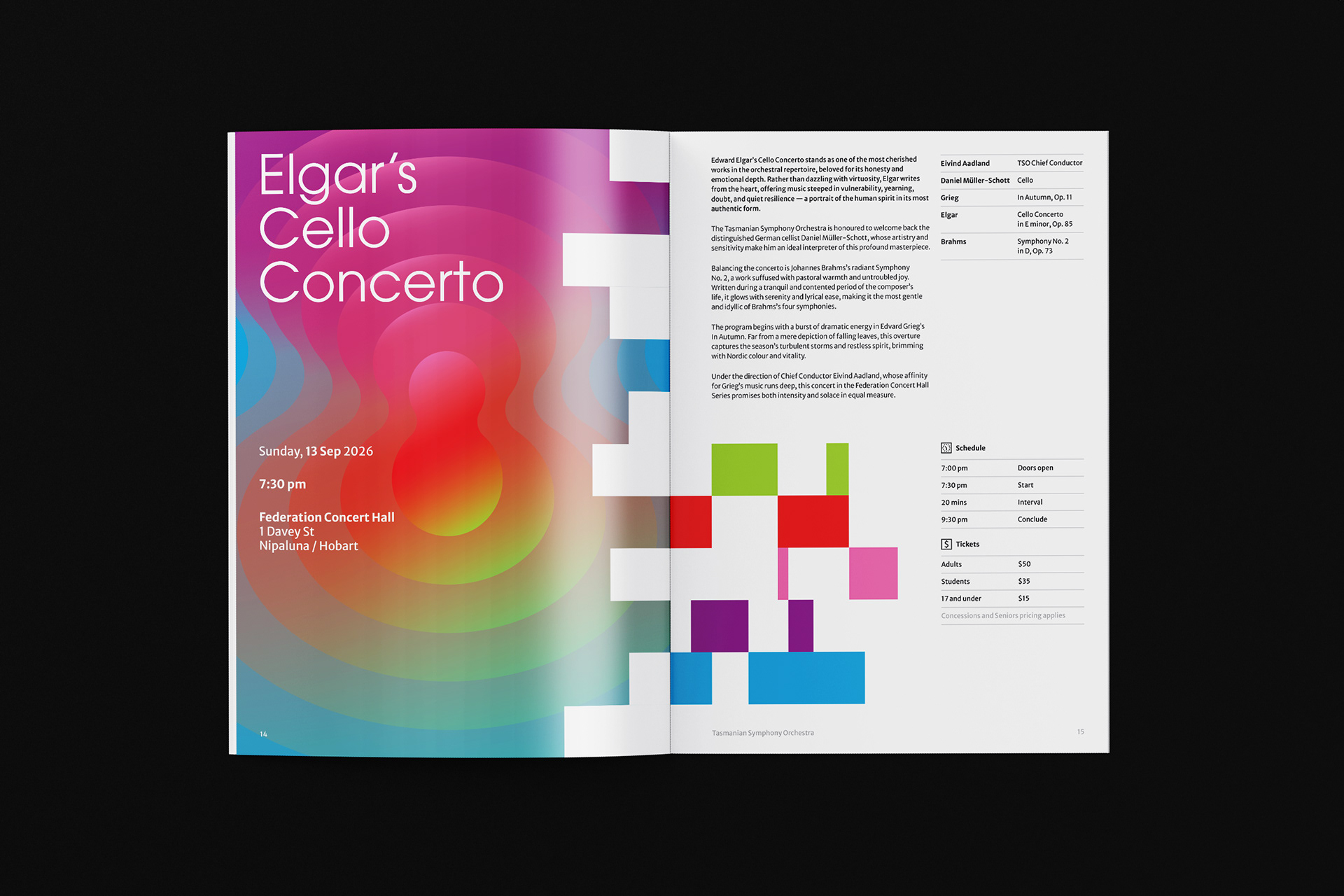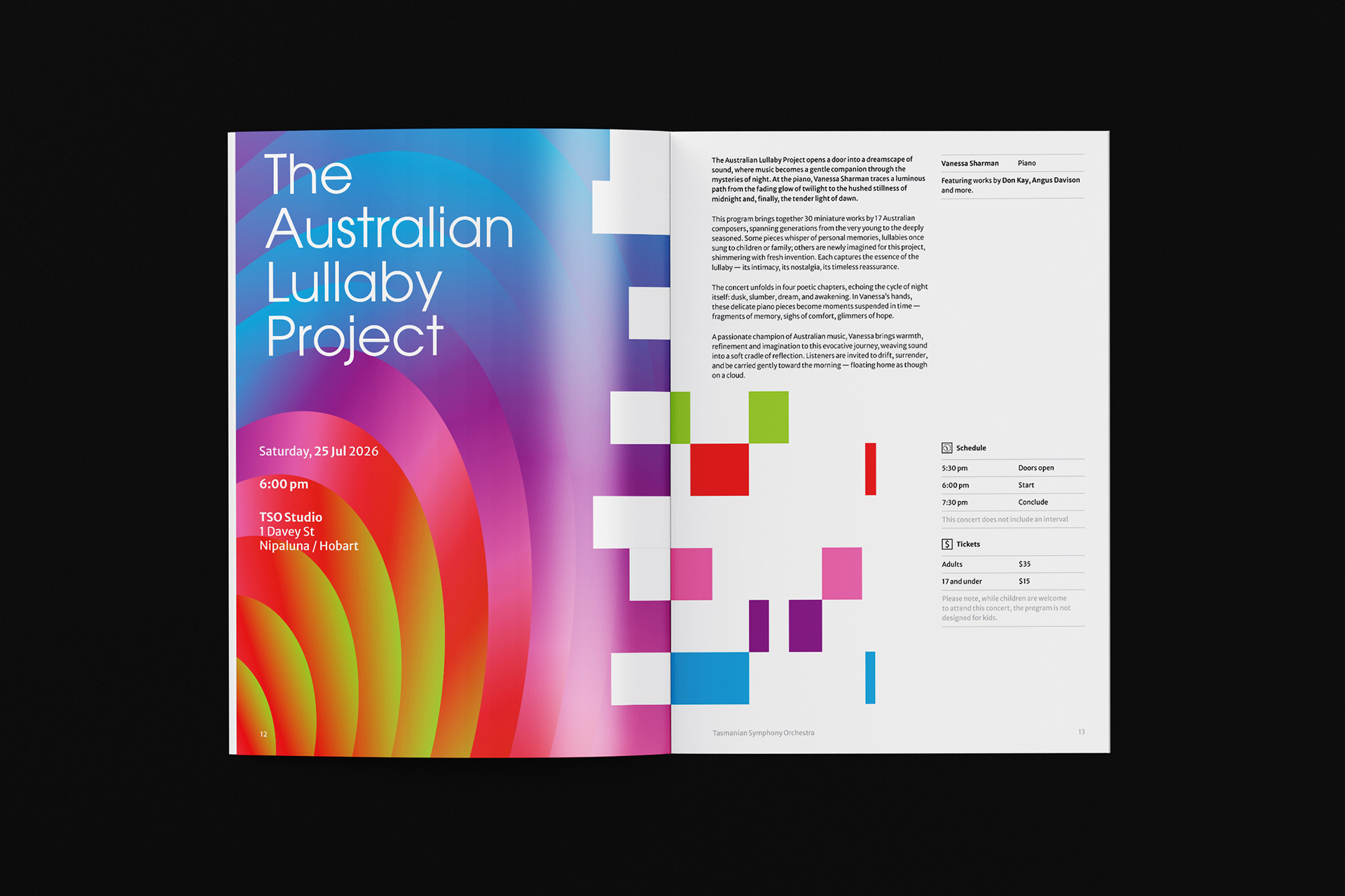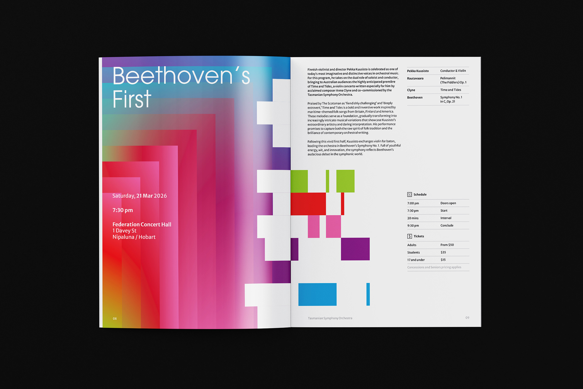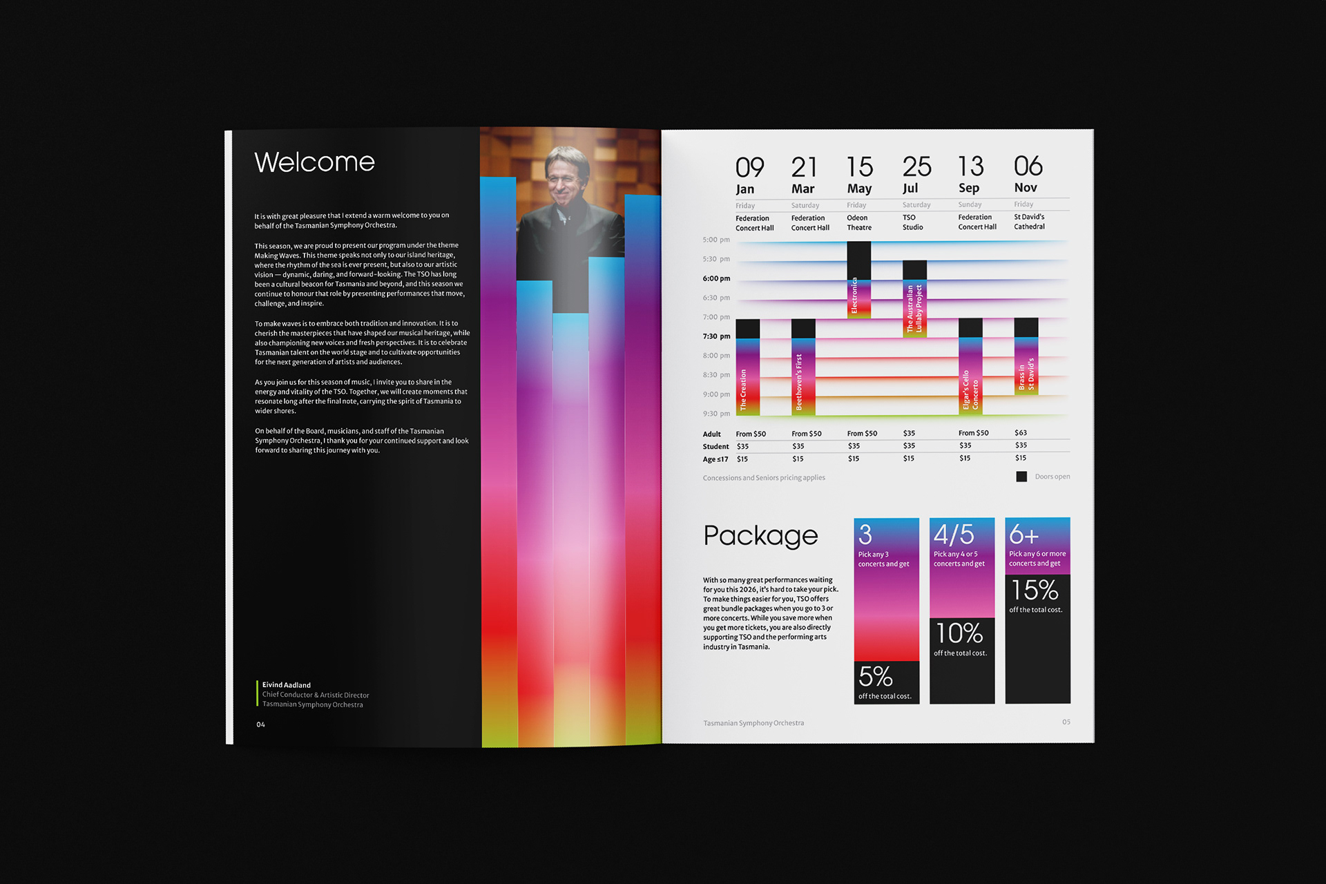 Tasmanian Symphony Orchestra rebrand introduces a logo with an abstract representation of the Tasmania island, constructed with five columns — a reference to the musical staff. From left to right, the columns grew from thin to thick, with narrowing gaps in between, descending then ascending, suggesting movement and rhythm. Brand colours are inspired by the vivid, magical Southern Lights. This multicolour, asymmetrical approach symbolizes the union of different musical instruments played by and for people from all walks of life.